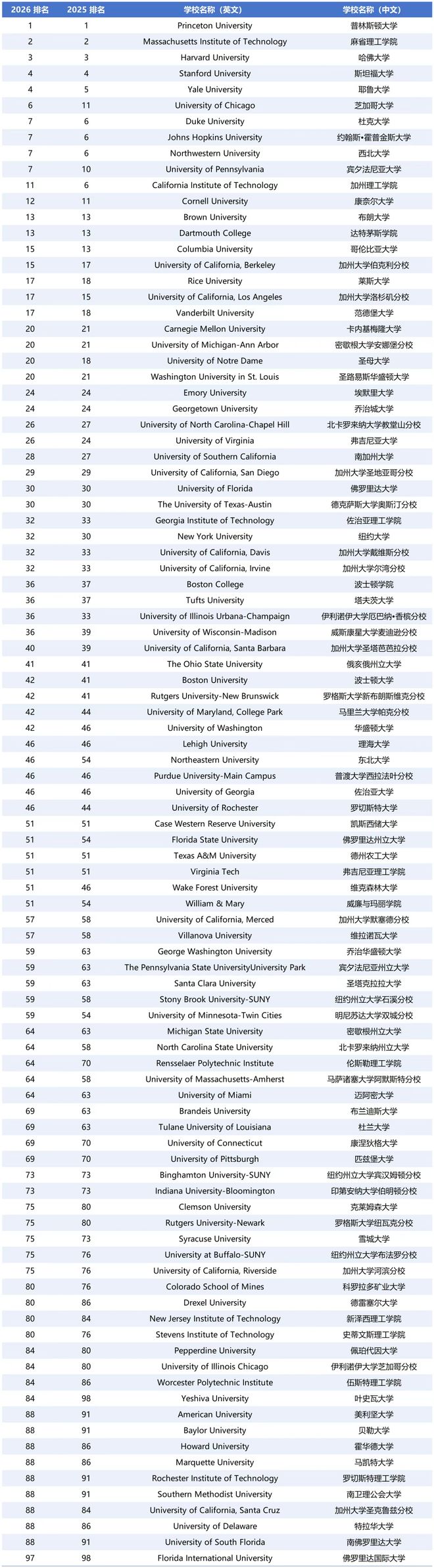 在最新发布的 2026 全美大学排名中,Top 100 又会花落谁家呢?你的梦校排名究竟是上升还是下跌?话不多说,快来一探究竟吧!